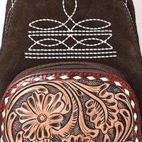 Crafted for the modern cowgirl with a love for tradition, this Genuine suede Sling Bag features intricate white Western stitching and a hand-tooled leather floral pocket in natural tones. The rich chocolate Genuine suede body adds warmth and rustic character.