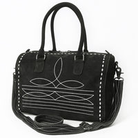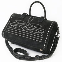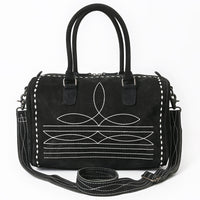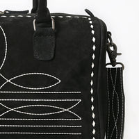 Sleek, structured, and full of Western attitude, this black Genuine suede duffel-style handbag is the perfect everyday carry or weekend companion. Featuring bold white hand-stitched embroidery in a geometric motif, it blends utility and style with top handles and a removable shoulder strap for versatility. Lightweight yet spacious, this bag offers a rugged elegance perfect for travel, daily use, or rodeo-ready fashion.