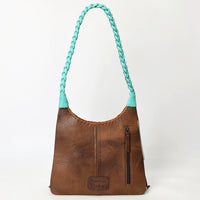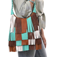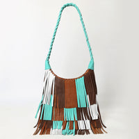 ADBG1594 Western Fringe Leather Hobo Bag - Turquoise, Brown & White Patch Fringe Purse