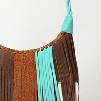 Turn heads with this bold and playful Western fringe Hobo bag. Designed for cowgirls who love to make a statement, it features cascading layers of genuine leather fringe in a striking patch pattern of turquoise, chocolate brown, and crisp white. The thick, braided shoulder strap adds a stylish and comfortable touch for all-day wear.