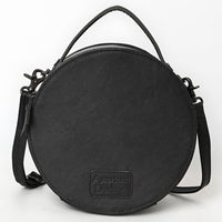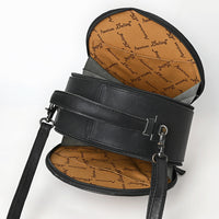 Stand out in Western elegance with this handcrafted round leather Canteen bag, combining natural cowhide with intricate hand-tooled floral artistry. The circular front features a rich tan leather base with turquoise floral carving and basketweave pattern, framed by rustic metal studs for added charm. The surrounding natural cowhide adds an authentic Western touch to this truly unique piece.