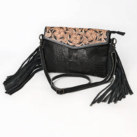ADBG1606 Black Tooled Leather Fringe Wallet Bag with Croc-Embossed Body & Floral Flap