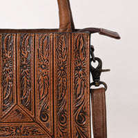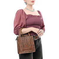 Elevate your Western wardrobe with this compact yet bold hand-tooled leather crossbody tote bag. Featuring a symmetrical geometric floral design carved into rich brown leather, this piece merges artistic flair with everyday practicality. Its structured form and intricate detailing showcase the craftsmanship that defines authentic Western fashion.