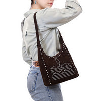 Bring warmth and Western simplicity to your everyday look with this soft Genuine suede Hobo bag. Featuring clean white embroidered stitching in a Southwestern geometric pattern and whipstitch edging, this bag offers a perfect balance of rustic charm and casual elegance.