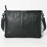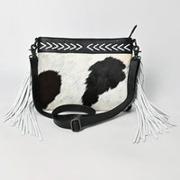 ADBG1628 Black & White Cowhide Leather Crossbody Bag with White Fringe and Arrow Stitch Detail