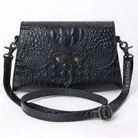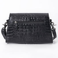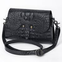 Make a bold, luxurious statement with this sleek black croc-embossed leather crossbody bag. Featuring a striking textured finish and a structured silhouette, this bag blends rugged Western vibes with upscale edge. The flap-style closure with dual rivet accents and a matching adjustable strap make it both stylish and practical for everyday or evening wear.