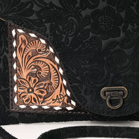 Crafted from premium full grain vegetable-tanned American cowhide, the bag features deep floral tooling in a bold black finish. The structured silhouette is ideal for carrying essentials on the go, while a strap ensures comfort whether worn crossbody or over the shoulder.