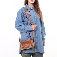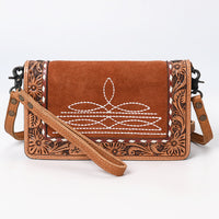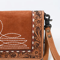 Small in size, big on Western charm—this handcrafted Organiser bag features a luxurious tan Genuine suede front flap adorned with white embroidery and framed in intricately tooled floral leather. The structured design is complemented by contrast whipstitching and a sleek adjustable leather strap, making it the perfect everyday or evening accessory for the modern cowgirl.