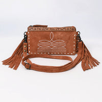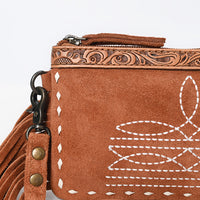 Add rustic charm to your daily essentials with this compact crossbody bag crafted from soft tan Genuine suede. The bag features detailed white Western-style embroidery on the front, paired with elegant floral tooled leather along the top for a bold artisan touch. Decorative fringe on both sides adds movement and flair, making this the perfect accessory for rodeos, concerts, or everyday Western wear.