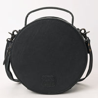 Step into the spotlight with this uniquely crafted round Canteen bag from American Darling. Made from luxurious black quilted leather and framed by an exquisitely hand-tooled floral leather border, this bag combines bold Western charm with a modern silhouette.