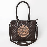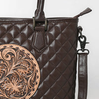 ADBG1689 Dark Brown Quilted Leather Tote Bag with Tooled Round Floral Medallion - American Darling