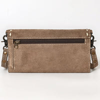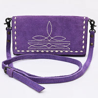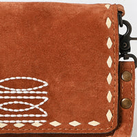This compact genuine leather Wallet bag features classic Western charm with white whipstitch detailing and a rustic hand-sewn motif on the flap. Made from soft, durable Genuine suede-finish leather, it's the perfect lightweight accessory for everyday use. The leather strap offers comfortable hands-free wear, while the flap closure keeps your essentials secure. A blend of function and frontier-inspired style, perfect for rodeos, markets, and casual outings.