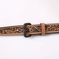 The front panel is bordered with hand-tooled floral leather, meticulously carved and antique-finished by skilled Texas artisans. A durable, wide leather strap with matching tooling allows for shoulder or crossbody wear, while the spacious interior accommodates your everyday essentials with ease.