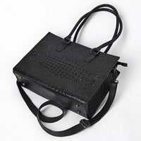 Sleek, structured, and sophisticated, this black tote bag features an embossed crocodile pattern that brings bold texture and timeless edge to any outfit. Crafted from genuine leather, the bag is designed with both function and style in mind—complete with dual rolled handles and a detachable, crossbody strap for versatile carry options. A top zipper closure keeps your essentials secure, making it perfect for daily use, travel, or modern Western fashion with a luxe twist.