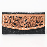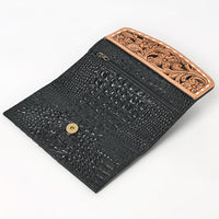 ADBG1745 Tooled Leather Floral Wallet Black Croc Embossed Base with Tan Hand-Carved Overlay