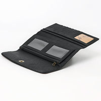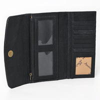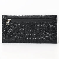 Crafted for the modern Western woman, this elegant wallet features a striking contrast between a black Croc embossed leather base and a hand-tooled floral overlay in warm tan leather. The front flap showcases intricate Western floral carvings framed with whipstitch detailing, highlighting artisan craftsmanship at its finest. Compact yet functional, this wallet is designed to hold your essentials in style—ideal for rodeo nights, Western weddings, or as a matching companion to your favorite tooled leather bag.