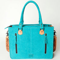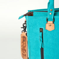 Bright, bold, and unmistakably Western—this handcrafted tote bag blends vibrant personality with artisan craftsmanship. The body features rich embossed leather, beautifully accented by hand-tooled floral leather panels on each side. A matching tooled leather strap and dual rolled handles add to the functional elegance, while long turquoise fringe tassels provide extra Western flair. This bag is both a fashion-forward statement and a practical everyday essential, ideal for cowgirls, rodeo-goers, or boutique style lovers.