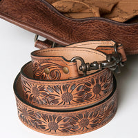 This beautiful Western tote bag is made from real leather with hand-carved floral patterns. It has a bright saddle blanket design in the center and leather fringes that give it a classic Western look. The bag has two strong leather handles and a leather shoulder strap with matching floral carving, so you can carry it the way you like.