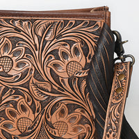 This hand-tooled leather Messenger bag embodies classic Western craftsmanship with an elegant twist. Featuring a rich floral tooled pattern carved into genuine full-grain leather, this piece showcases intricate artistry that speaks of heritage and durability.