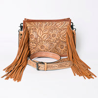 ADBG325 Light Tan Hand-Tooled Leather Crossbody Bag with Daisy Floral Design and Fringe
