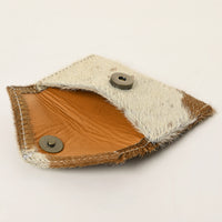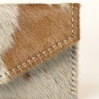 Sleek, stylish, and crafted with rustic charm, this envelope-style card holder is made from genuine hair-on cowhide. Its compact size makes it perfect for carrying business cards, credit cards, or folded cash. The angled envelope flap adds a touch of modern Western sophistication, while detailed contrast stitching enhances the handmade appeal. A minimal yet bold accessory that slips easily into any bag or pocket.