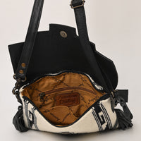ADBG587A Western Tooled Leather Crossbody Bag with Fringe and Woven Fabric