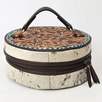 Protect your precious jewelry in true Western style with our handcrafted round leather jewelry case. Made from premium hair-on hide and accented with intricate hand-tooled floral patterns, this piece is a functional work of art. A turquoise and white inlay border adds an extra touch of rustic charm, while the secure zipper closure and sturdy leather handle offer convenience on the go. Whether for travel or display, this compact case blends heritage craftsmanship with everyday practicality.