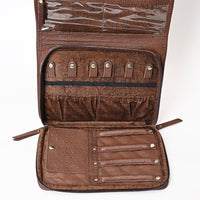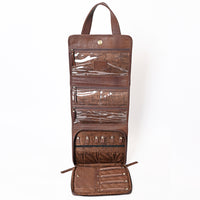 Celebrate your faith in Western style with this genuine leather mini Bible tote featuring a hand-tooled floral cross patch. Crafted from black and white hair-on cowhide with chocolate brown leather handles and trim, this small tote is ideal for carrying your Bible, devotional books, or other personal items.