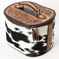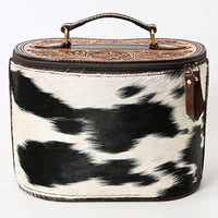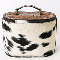 Capture the spirit of the West with this ruggedly elegant Jewelry case crafted from distressed brown leather,genuine black and white hair-on cowhide and topped with a hand-tooled floral lid. The beautifully carved floral artwork on the lid and sides adds a refined Western charm, while the durable construction makes it a practical accessory for travel or daily use.