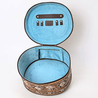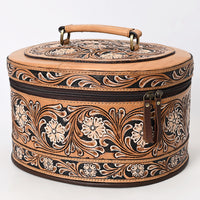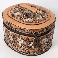 Carry your accessories in timeless Western style with this handcrafted oval leather Jewelry Case. Featuring intricate hand-tooled floral and paisley patterns across the entire body and lid, this structured case makes a statement wherever you go.