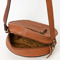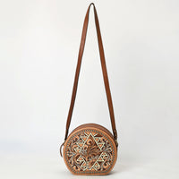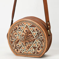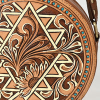 Elevate your Western wardrobe with this beautifully structured canteen bag by American Darling. Crafted from genuine full-grain leather, this round crossbody features an intricate hand-tooled floral pattern enclosed in a geometric star design, accented by turquoise studs for an extra Southwestern flair.