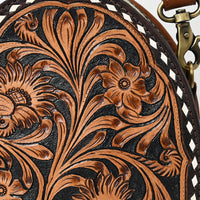 Embrace authentic Western charm with this round canteen crossbody bag, masterfully handcrafted from full-grain leather. The circular silhouette showcases detailed floral tooling with white whipstitch accents, making it a statement piece for any cowgirl.
