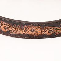 The floral-tooled leather strap and closure tab are artfully designed and richly detailed, while the whipstitch trim around the edges adds texture and durability. The adjustable, tooled leather strap makes this a practical and standout piece for rodeos, fairs, or everyday wear.