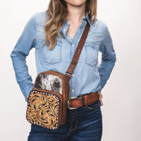 Compact, stylish, and authentically Western — this sling bag is the perfect blend of artistry and function. The main body features a genuine hair-on cowhide panel, while the front zip pocket showcases intricate hand-tooled floral leather framed with white whipstitch lacing.