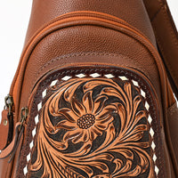 ADBGA662 Brown Leather Sling Backpack with Tooled Floral Front Pocket