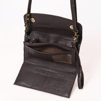 The flap-over closure provides a clean silhouette, while antique brass hardware and a strap add both charm and function. Ideal for Western nights out, rodeo events, or everyday use with a country-chic twist.