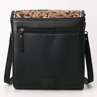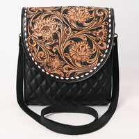 Elevate your Western style with this vertical black crossbody bag, featuring a stunning floral hand-tooled leather flap. The intricate scroll and bloom pattern in rich tan and chestnut tones brings artisan detail to life, while the quilted black leather body offers a soft, modern contrast.