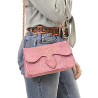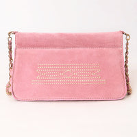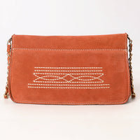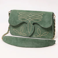 Sophisticated and Western-inspired, this clutch-style crossbody bag features beautiful cream embroidery across a soft Genuine suede-style finish. The scalloped flap with central stitched motif adds elegance, while the wide embroidered shoulder strap is paired with a gold-tone chain for a touch of upscale flair.