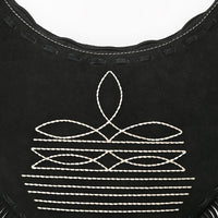 Unleash your inner cowgirl with this V-cut Genuine suede Crossbody bag featuring long cascading fringe and traditional white Western embroidery. The sharp V-shaped front adds a bold silhouette, while decorative whipstitching enhances the authentic Western charm.