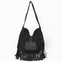 Its gently rounded V-shape, spacious interior, and bold fringe finish give it a rustic yet refined cowgirl charm.