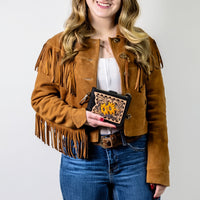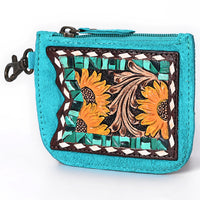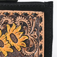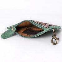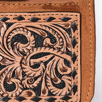 Carry a piece of Western artistry wherever you go with this compact hand-tooled leather coin purse. Featuring intricate scrollwork in a classic floral pattern, this mini pouch is crafted from genuine leather with a rich tan finish and bold black background. The secure zip-top closure keeps your coins and small essentials safe, while the metal swivel clasp allows for easy attachment to bags, belt loops, or keyrings. It’s the perfect everyday accessory for cowgirls, rodeo lovers, and Western fashion enthusiasts.