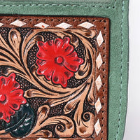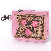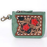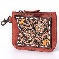 ADBGA746 Tooled Leather Coin Purse - Red Floral Design with Zipper & Clip Hook