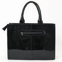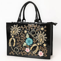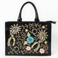 ADBGA838 Black Patent Western Tote Bag - Embroidered Floral & Spur Design with Glossy Finish
