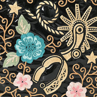 Add a bold splash of Western flair to your wardrobe with this glossy black patent leather tote bag. Eye-catching embroidery features vibrant floral blooms, golden cowboy spurs, and star motifs set against a swirling vine pattern. The structured silhouette and glossy finish offer a fashion-forward take on classic cowgirl style, while dual top handles and a secure zip-top closure make it practical for everyday carry.