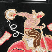 Turn heads with this bold and glossy Western tote bag featuring a stunning embroidered rodeo cowboy scene. Crafted from high-shine black patent faux leather, the front showcases a vibrant depiction of a bronc rider flanked by red horseshoes and Western stars. The structured body and twin top handles provide both style and function, making it perfect for events, travel, or everyday cowgirl glam.