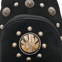 The handpicked cowhide hair-on genuine leather not only adds a soft and tactile element but also serves as an embellishment, enhancing its overall western appearance.The flap is heavily decorated with silver-toned hardware, including a large, central square concho with a floral design, four smaller round conchos, and numerous small studs.