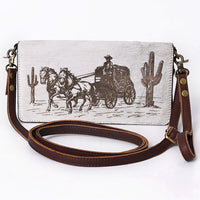 Embrace the spirit of the Old West with this unique hair-on-hide leather crossbody purse. Featuring a vintage-style western scene etched across a white cowhide background, this bag captures classic Western storytelling in fashion form. The rich brown leather trim and crossbody strap add comfort, style, and versatility.