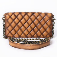 Elevate your Western-chic look with this quilted leather crossbody purse. Crafted from premium distressed tan leather, the bag features a vintage diamond-stitched quilt design for a touch of rustic sophistication. The antique-finish chain strap with a leather shoulder pad adds comfort and edge, making it perfect for day-to-night transitions.