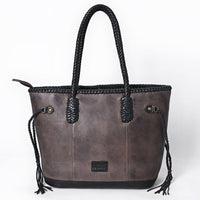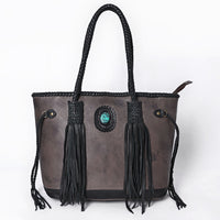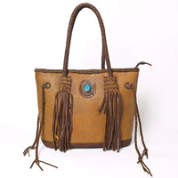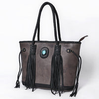 Capture classic Western charm with this handcrafted leather tote bag, featuring detailed braided leather handles and fringe accents. A bold turquoise concho adorns the front, giving it an eye-catching focal point rooted in rustic elegance. Finished with deep brown leather fringe, side cinch ties, and full-grain leather body, this tote blends functionality with timeless cowgirl fashion.