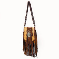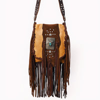 ADBGM483 Western Fringe Leather Messenger - Rectangular Turquoise Concho & Studded Strap